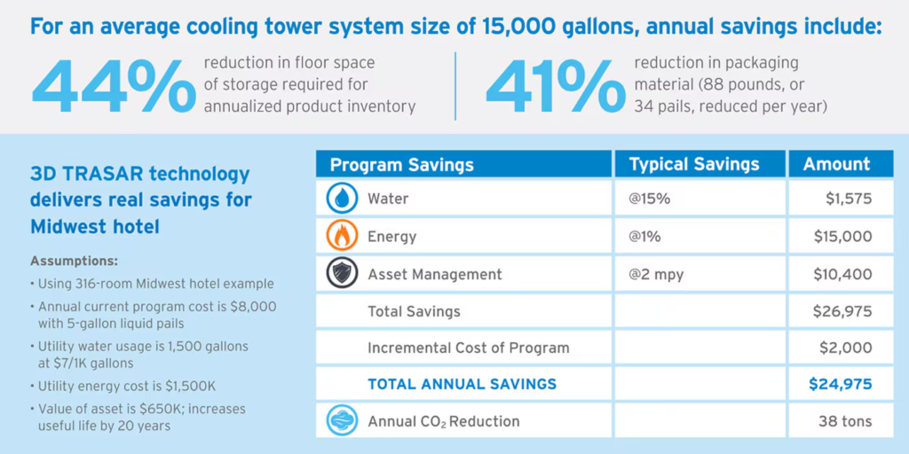 Rethink your cooling water treatment with our safe, simple and sustainable solid water treatment solution. Our patented 3D TRASARâ„¢ automation technology reduces operating costs and extends asset life with real-time measurement and 24/7 oversight of your cooling water treatment.
