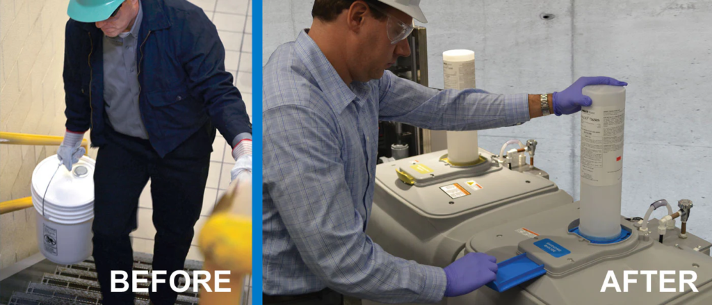 Our solid chemistry is packaged as dry bricks and canisters, eliminating the need to haul heavy pails or measure and handle liquid chemistries.